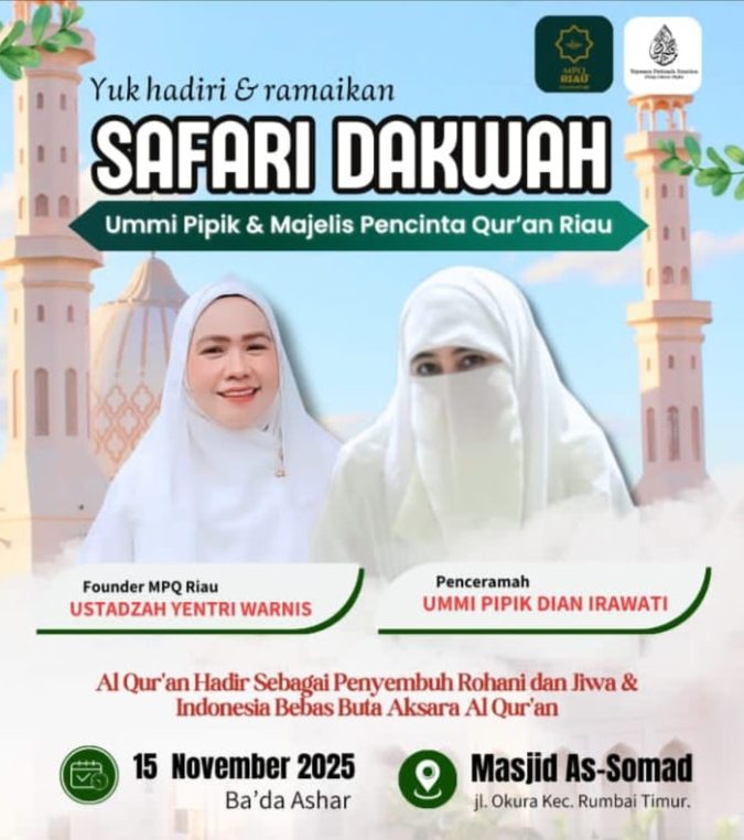”Mari bersama-sama kita ramaikan masjid, hadirkan hati kita, dan saksikan langsung Safari Dakwah Umi Pipik. Jadikan 15 November 2025 sebagai hari penuh berkah di Masjid Ash Shomad,” ajak perwakilan Majelis Pencinta Qur’an Riau.