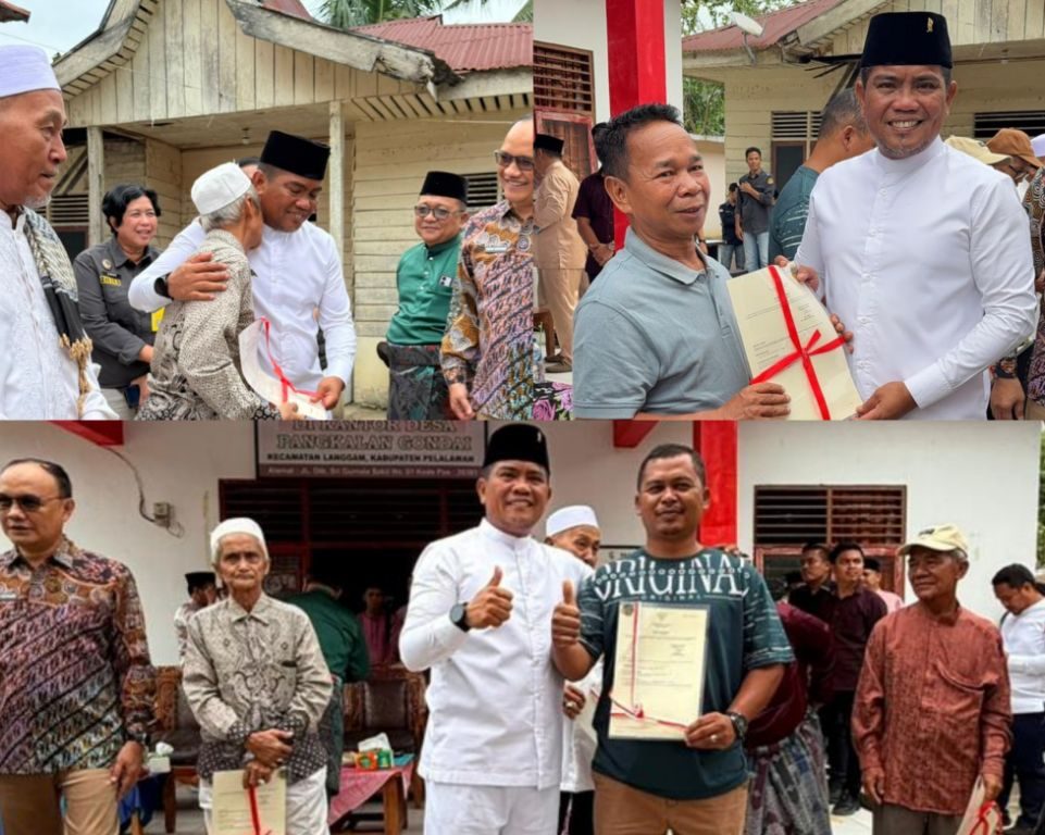 Pelalawan — Allnewsterkini. Com|Bupati Pelalawan H. Zukri, SM, MM secara langsung menyerahkan sertifikat Program Redistribusi Tanah Tahun 2025 kepada masyarakat Kecamatan Langgam, khususnya Desa Pangkalan Gondai. Sebanyak 236 warga menerima sertifikat sebagai bentuk kepastian hukum atas kepemilikan tanah mereka. Kegiatan berlangsung di Kantor Desa Pangkalan Gondai, Jumat (28/11/2025).