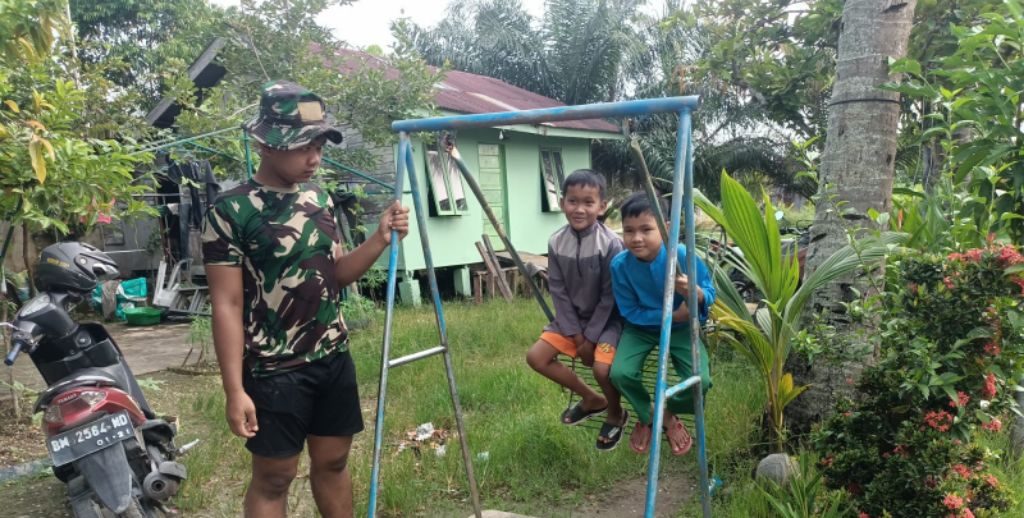 Allnewsterkini. Com | Pekanbaru – Sebagai bentuk keakraban anggota TNI terhadap masyarakatnya, Pratu Monte yang juga merupakan Anggota Satgas TMMD, bermain ayunan dengan anak yang masih berusia 7 tahun, di kampung tarandam RT 04 RW 03 Kelurahan Meranti Pandak Kecamatan Rumbai Kota Pekanbaru, Minggu (02/06/2024).