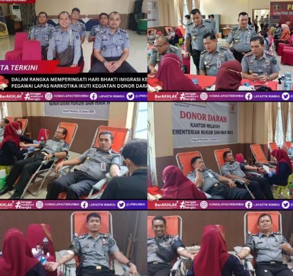 Allnewsterkini. Com | Pekanbaru – Pegawai Lembaga Pemasyarakatan (Lapas) Narkotika Kelas IIB Rumbai melaksanakan kegiatan donor darah di dalam rangka memperingati Hari Bhakti Imigrasi ke-74 Tahun 2024. Kegiatan donor ini juga merupakan bentuk perhatian Kemenkumham kepada orang yang membutuhkan. Donor darah dilaksanakan di Kantor Imigrasi Pekanbaru Jalan Teratai No.87 pada Senin (22/01/2024).