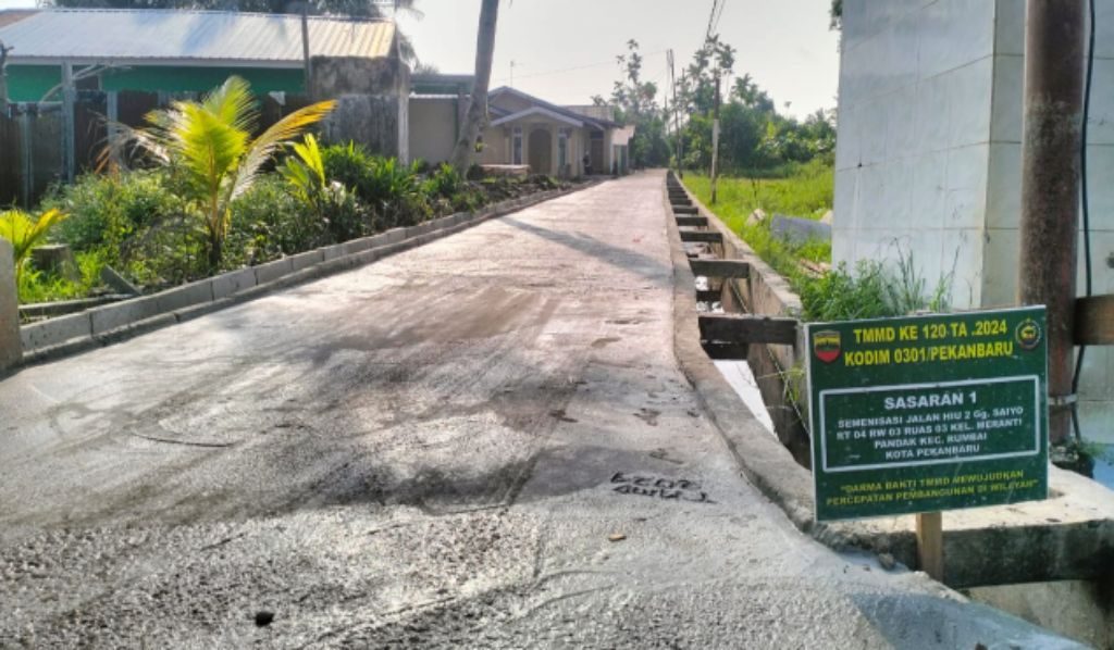 Dan SSK TMMD Letda Arh Sumaryono menjelaskan pengerjaan semenisasi ruas 03 Jalan Hiu 2 gang Saiyo Kelurahan Meranti Pandak Kecamatan Rumbai sudah rampung 100 persen.