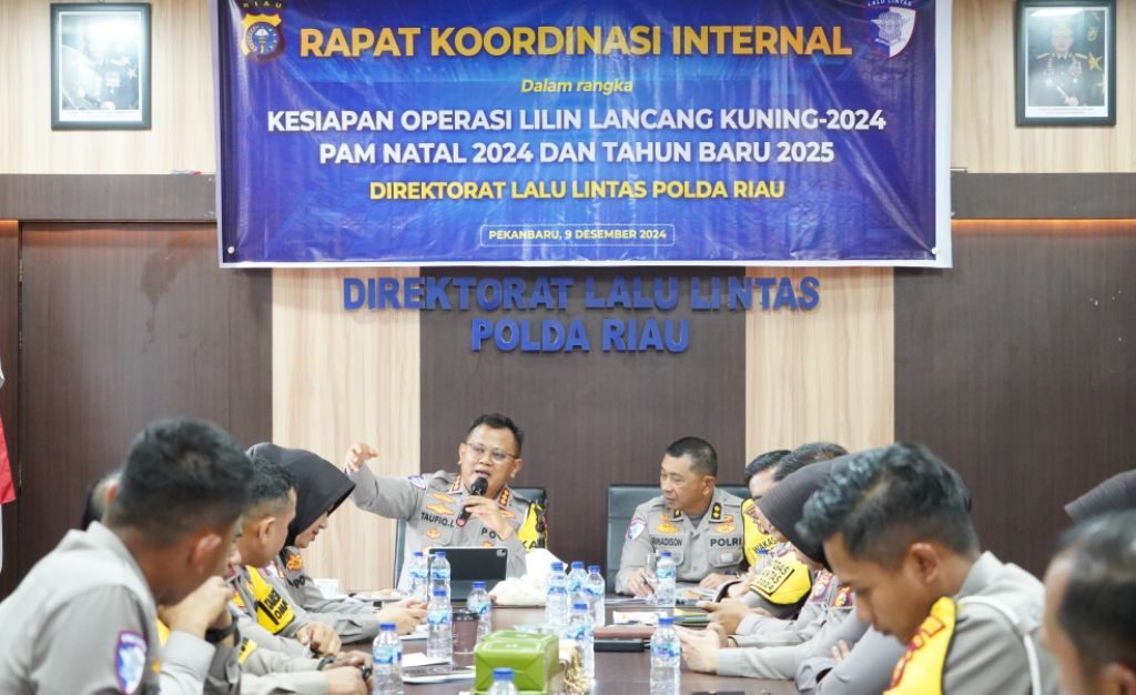 Allnewsterkini. Com | Pekanbaru — Dalam rangka kesiapan Operasi Lilin Lancang Kuning 2024 dan Pengamanan Natal dan Tahun Baru 2025, Direktur Lalu Lintas ( DIRLANTAS) Polda Riau Kombes Pol Taufiq Lukman Nurhidayat, S.I.K., M.H pimpin langsung kegiatan Rapat Koordinasi Internal Ditlantas Polda Riau yang berlangsung di Aula Rapat Mako Ditlantas Polda Riau.