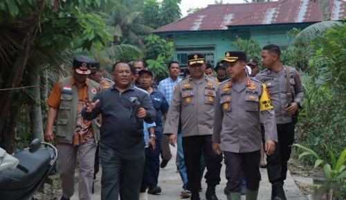 Allnewsterkini. Com | SIAKHULU- Kapolres Kampar AKBP Ronald Sumaja bersama Forkopimda Kampar mengunjungi TPS (Tempat Pemungutan Suara) yang akan digunakan, saat ini masih digenangi banjir di Desa Tanjung Balam, Kecamatan Siak Hulu, Kabupaten Kampar, Jumat (2/2/2024) sekira pukul 10.00 WIB.