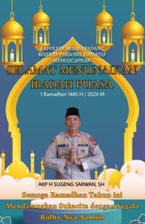 Allnewsterkini.Com | Banyuasin Muara Padang – Dalam rangka menyambut bulan suci Ramadhan 1445H 2024 M, Kepolisian Sektor Muara Padang Polsek Berserta Jajaran mengucapan Selamat Menunaikan Ibadah Puasa Ramadhan 1445 H oleh Kapolsek Muara Padang, AKP H Sugeng Sarwan, SH, Kecamatan muara Padang, Kabupaten Banyuasin, dengan harapan Semoga Amal Ibadah Kita diterima.