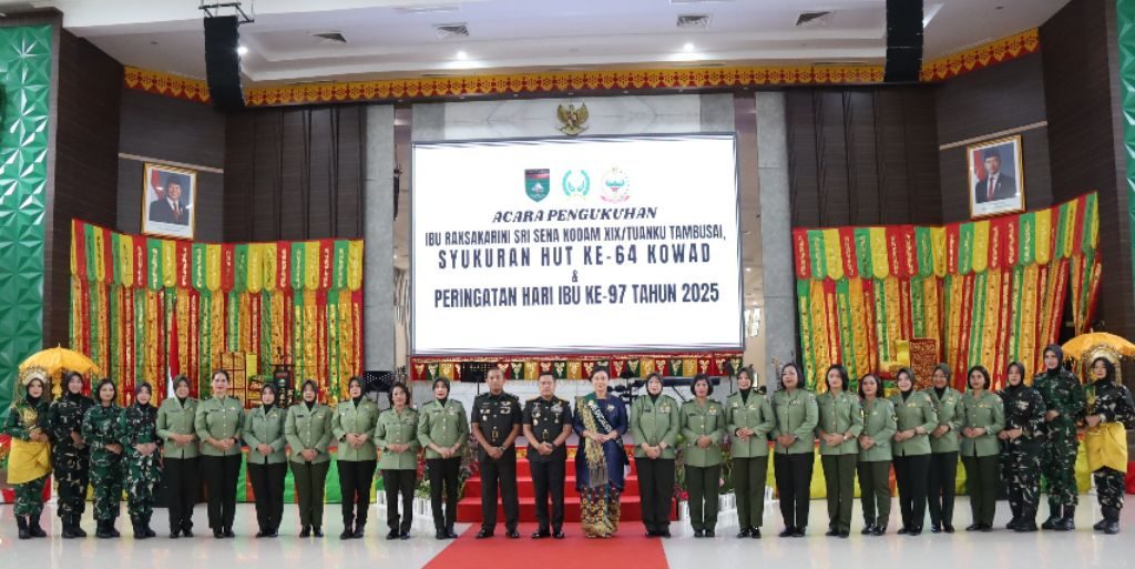 PEKANBARU — Allnewsterkini. Com | Kodam XIX/Tuanku Tambusai menyelenggarakan kegiatan Pengukuhan Ibu Raksakarini Sri Sena Kodam XIX/Tuanku Tambusai yang dirangkaikan dengan Perayaan HUT ke-64 Korps Wanita Angkatan Darat (Kowad) serta Peringatan Hari Ibu ke-97 Tahun 2025. Kegiatan ini berlangsung di Aula Kodam XIX/Tuanku Tambusai, Pekanbaru, Provinsi Riau, dalam suasana khidmat dan penuh makna.Kamis 18/12/25.