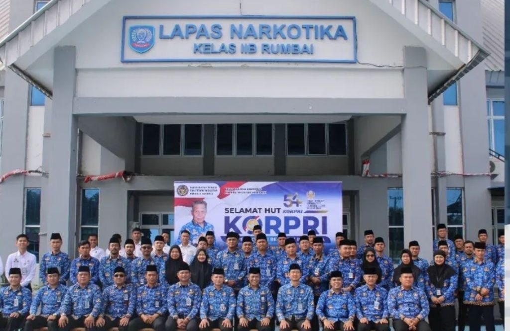 Pekanbaru – Allnewsterkini. Com | Upacara peringatan Hari Ulang Tahun Korps Pegawai Republik Indonesia (KORPRI) ke-54 tahun 2025 berlangsung khidmat di Lapas Narkotika Kelas IIB Rumbai pada Senin (01/12).
