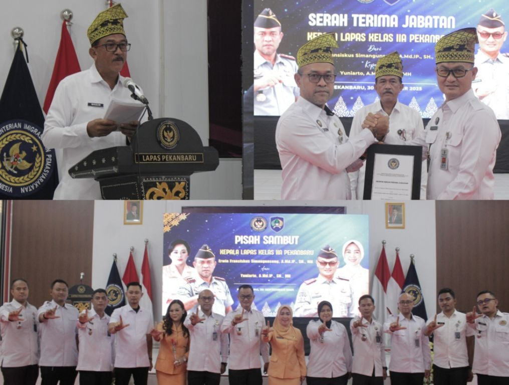 Yuniarto juga menyampaikan apresiasi setinggi-tingginya kepada Erwin Fransiskus Simangunsong atas dedikasi dan kepemimpinannya selama menjabat sebagai Kalapas Pekanbaru. “Mari kita lanjutkan fondasi yang telah dibangun adinda Erwin, menyatukan langkah, menyongsong masa depan dengan semangat baru, serta menjadikan Lapas Pekanbaru sebagai Lapas yang unggul, profesional, dan berintegritas,” ajak Kalapas.